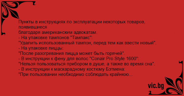 благодаря американским адвокатам. - На упаковке тампонов "Тампакс": "Удалить использованный тампон, перед тем как ввести новый". - На упаковке пиццы: "После разогревания пицца может быть горячей". - В инструкции к фену для волос "Conair Pro Style 1600": "Нельзя пользоваться прибором в душе, а также во время сна". - В инструкции к маскарадному костюму Бэтмена: "При пользовании необходимо соблюдать крайнюю осторожность: маска и нагрудник не обладают защитными свойствами; плащ не дает возможности летать". - На баллоне с пропаном: "Пламя может вызвать пожар". - На упаковке замороженных продуктов: "Перед употреблением рекомендуется разморозить". - В инструкции к резиновой шапочке для плавания: "Надевать строго на одну голову". - На дне коробки от торта: "Не переворачивать коробку вверх дном". - В инструкции к утюгу: "Не гладить белье на теле". - На бутылочке с детским сиропом: "Запрещается употреблять водителям автотранспорта, а также лицам, работающим на конвейерном производстве". - В аннотации к снотворному: "Может вызвать сонливость". - В инструкции к новогодней гирлянде китайского производства: "Использовать только в помещениях или на улице". - На пакетиках с орешками, выдаваемых на "Американских авиалиниях": "Инструкция: 1) открыть пакет; 2) съесть орехи.". - В инструкции по эксплуатации электропилы: "Не пытаться остановить цепь руками".