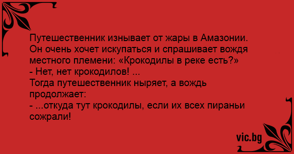 Он очень хочет искупаться и спрашивает вождя местного племени: «Крокодилы в реке есть?»