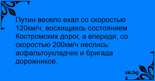 Путин весело ехал со скоростью 120км/ч, восхищаясь состоянием Костромских дорог, а впереди, со скоростью 200км/ч неслись: асфальтоукладчик и бригада дорожников.