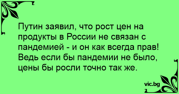 Путин заявил, что рост цен на продукты в России не связан с пандемией - и он как всегда прав! Ведь если бы пандемии не было, цены бы росли точно так же.