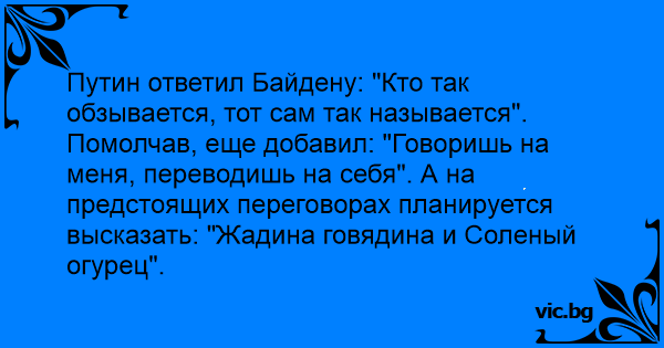 Путин ответил Байдену: "Кто так обзывается, тот сам так называется". Помолчав, еще добавил: "Говоришь на меня, переводишь на себя". А на предстоящих переговорах планируется высказать: "Жадина говядина и Соленый огурец".