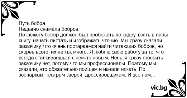 По сюжету бобер должен был пробежать по кадру, взять в лапы книгу, начать листать и изображать чтение. Мы сразу сказали заказчику, что очень постараемся найти читающих бобров, но скорее всего, их не так много. Я люблю свою работу за то, что всегда сталкиваешься с чем-то новым. Нельзя сразу говорить заказчику нет, потому что мы профессионалы. Поэтому мы сказали, что обязательно поищем и начали искать. По зоопаркам, театрам зверей, дрессировщикам. И все нам говорили: «Вы в своем уме? Бобры не поддаются дрессировке. И даже если поддаются, то нужны месяцы, чтобы заставить читать». А у нас съемка через неделю, но мы все равно искали. И вот к концу третьего дня в дверях офиса появляется торжественный администратор, насквозь пропахший ветром и бобрами, который говорит, что есть один частный бобрятник в Подмосковье, который он нашел, и даже снял там небольшое видео. На этом видео бобер по команде «Начали!» вбегал в кадр, брал в лапы книгу и начинал ее листать. Оказывается, в этом бобрятнике иногда проводят небольшие представления для детей и там как раз есть такой концертный номер. Мы страшно обрадовались и выслали видео заказчику. Нас переполняли то радость, то волнение, то гордость. Приходит ответ: «Нет. Это какой-то темный бобер. И у него странный хвост. Нужно поискать более светлого бобра и более крупного. Напоминаем, что съемки скоро и просим поторопиться. За три дня от вас пришел только один бобер, мы рассчитывали на варианты». Как известно, от бобра бобра не ищут. Продюсер сел писать ответ, но все время стирал первую строчку, потому что каждый раз начинал с вопроса: «Вы о#уели?» Нельзя сразу начинать письмо так, потому что мы профессионалы. Поэтому мы сказали, что обязательно поищем и начали искать. Звоним в бобрятник и уточняем наличие более светлых читающих бобров с красивыми хвостами (желательно покрупнее). Нам говорят: «Вы о#уели?» Не потому что они непрофессионалы, а просто нормальные люди.