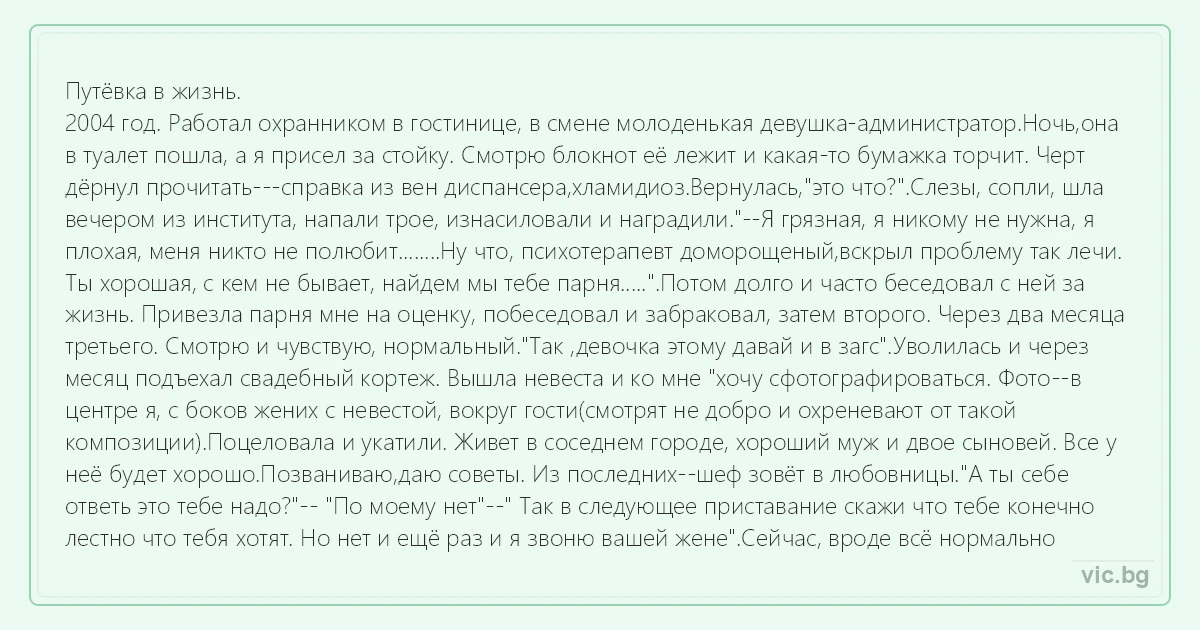Путёвка в жизнь. 2004 год. Работал охранником в гостинице, в смене молоденькая девушка-администратор.Ночь,она в туалет пошла, а я присел за стойку. Смотрю блокнот её лежит и какая-то бумажка торчит. Черт дёрнул прочитать---справка из вен диспансера,хламидиоз.Вернулась,"это что?".Слезы, сопли, шла вечером из института, напали трое, изнасиловали и наградили."--Я грязная, я никому не нужна, я плохая, меня никто не полюбит........Ну что, психотерапевт доморощеный,вскрыл проблему так лечи. Ты хорошая, с кем не бывает, найдем мы тебе парня.....".Потом долго и часто беседовал с ней за жизнь. Привезла парня мне на оценку, побеседовал и забраковал, затем второго. Через два месяца третьего. Смотрю и чувствую, нормальный."Так ,девочка этому давай и в загс".Уволилась и через месяц подъехал свадебный кортеж. Вышла невеста и ко мне "хочу сфотографироваться. Фото--в центре я, с боков жених с невестой, вокруг гости(смотрят не добро и охреневают от такой композиции).Поцеловала и укатили. Живет в соседнем городе, хороший муж и двое сыновей. Все у неё будет хорошо.Позваниваю,даю советы. Из последних--шеф зовёт в любовницы."А ты себе ответь это тебе надо?"-- "По моему нет"--" Так в следующее приставание скажи что тебе конечно лестно что тебя хотят. Но нет и ещё раз и я звоню вашей жене".Сейчас, вроде всё нормально