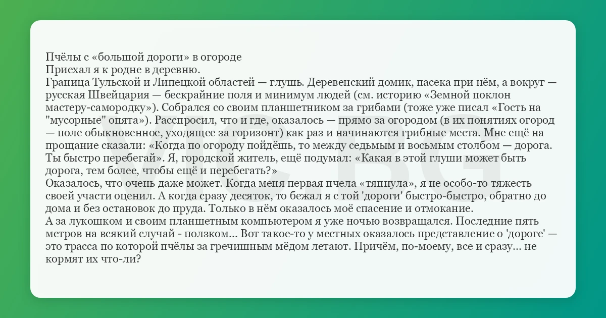Пчёлы с «большой дороги» в огороде Приехал я к родне в деревню. Граница Тульской и Липецкой областей — глушь. Деревенский домик, пасека при нём, а вокруг — русская Швейцария — бескрайние поля и минимум людей (см. историю «Земной поклон мастеру-самородку»). Собрался со своим планшетником за грибами (тоже уже писал «Гость на "мусорные" опята»). Расспросил, что и где, оказалось — прямо за огородом (в их понятиях огород — поле обыкновенное, уходящее за горизонт) как раз и начинаются грибные места. Мне ещё на прощание сказали: «Когда по огороду пойдёшь, то между седьмым и восьмым столбом — дорога. Ты быстро перебегай». Я, городской житель, ещё подумал: «Какая в этой глуши может быть дорога, тем более, чтобы ещё и перебегать?» Оказалось, что очень даже может. Когда меня первая пчела «тяпнула», я не особо-то тяжесть своей участи оценил. А когда сразу десяток, то бежал я с той 'дороги' быстро-быстро, обратно до дома и без остановок до пруда. Только в нём оказалось моё спасение и отмокание. А за лукошком и своим планшетным компьютером я уже ночью возвращался. Последние пять метров на всякий случай - ползком... Вот такое-то у местных оказалось представление о 'дороге' — это трасса по которой пчёлы за гречишным мёдом летают. Причём, по-моему, все и сразу... не кормят их что-ли?