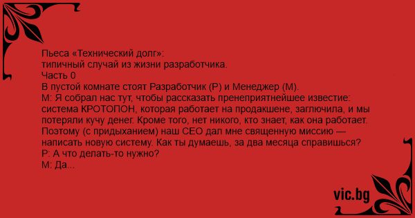 М: Я собрал нас тут, чтобы рассказать пренеприятнейшее известие: система КРОТОПОН, которая работает на продакшене, заглючила, и мы потеряли кучу денег. Кроме того, нет никого, кто знает, как она работает. Поэтому (с придыханием) наш СЕО дал мне священную миссию — написать новую систему. Как ты думаешь, за два месяца справишься?