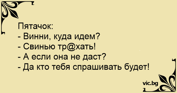 Пятачок:<br />- Винни, куда идем?<br />- Свинью тр@хать!<br />- А если она не даст?<br />- Да кто тебя спрашивать будет!