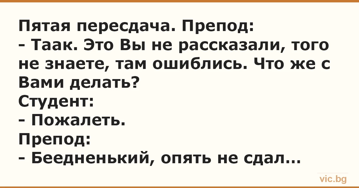 Пятая пересдача. Препод:<br />- Таак. Это Вы не рассказали, того не знаете, там ошиблись. Что же с Вами делать? <br />Студент: <br />- Пожалеть. <br />Препод: <br />- Беедненький, опять не сдал…