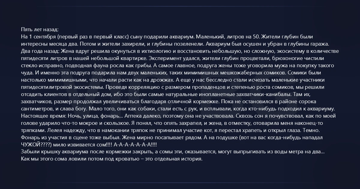 Пять лет назад: На 1 сентября (первый раз в первый класс) сыну подарили аквариум. Маленький, литров на 50. Жители глубин были интересны месяца два. Потом и жители захирели, и глубины позеленели. Аквариум был осушен и убран в глубины гаража. Два года назад: Жена вдруг решила окунуться в ихтиологию и восстановить небольшую, но сложную, экосистему в количестве пятидесяти литров в нашей небольшой квартирке. Эксперимент удался, жители глубин процветали, брюхоногие чистили стекло исправно, подводная фауна росла как грибы. А самое главное, подруга жены тоже уговорила мужа на покупку такого чуда. И именно эта подруга подарила нам двух маленьких, таких мимимишных мешкожаберных сомиков. Сомики были настолько мимимишными, что начали расти как на дрожжах. А еще у нас бесследно стали исчезать маленькие участники пятидесятилитровой экосистемы. Проведя корреляцию с размером пропаденцов и степенью роста сомиков, мы решили отсадить клиентов в отдельный дом, ибо это были самые натуральные инопланетные захватчики-канибалы. Там их, захватчиков, размер продолжал увеличиваться благодаря отличной кормежке. Пока не остановился в районе сорока сантиметров, и слава богу. Мало того, они как собаки, стали есть с рук, и всплывали, когда кто-нибудь подходил к аквариуму. Настоящее время: Ночь, улица, фонарь… Аптека далеко, поэтому она не участвовала. Сквозь сон я почувствовал, как по моей голове ударило что-то мокрое и скользкое. Я понял, что опять захрапел, и жена, в отместку, отоварила меня наконец-то тряпками. Лелея надежду, что в намокании тряпок не принимал участие кот, я перестал храпеть и открыл глаза. Темно. Фонарь из участия в сцене тоже выбыл. Жена мирно посапывает рядом. А на подушке (вот на вас когда-нибудь нападал ЧУЖОЙ????) мило извивается сом!!!! А-А-А-А-А-А-А!!!! Забыли крышку аквариума после кормежки закрыть, а сомы эти, оказывается, могут выпрыгивать из воды метра на два… Как мы этого сома ловили потом под кроватью – это отдельная история.