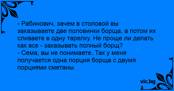 - Рабинович, зачем в столовой вы заказываете две половинки борща, а потом их сливаете в одну тарелку. Не проще ли делать как все - заказывать полный борщ?