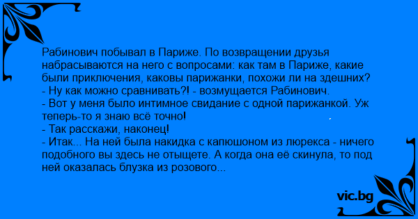 Рабинович побывал в Париже. По возвращении друзья набрасываются на него с вопросами: как там в Париже, какие были приключения, каковы парижанки, похожи ли на здешних?