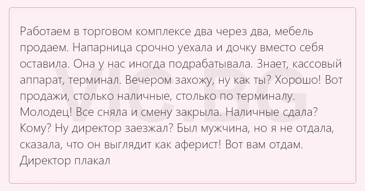 Работаем в торговом комплексе два через два, мебель продаем. Напарница срочно уехала и дочку вместо себя оставила. Она у нас иногда подрабатывала. Знает, кассовый аппарат, терминал. Вечером захожу, ну как ты? Хорошо! Вот продажи, столько наличные, столько по терминалу. Молодец! Все сняла и смену закрыла. Наличные сдала? Кому? Ну директор заезжал? Был мужчина, но я не отдала, сказала, что он выглядит как аферист! Вот вам отдам. Директор плакал