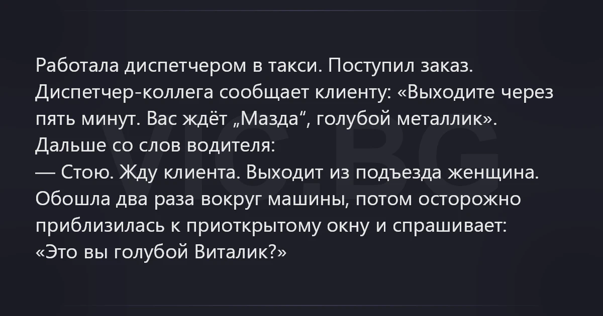 Работала диспетчером в такси. Поступил заказ. Диспетчер-коллега сообщает клиенту: «Выходите через пять минут. Вас ждёт „Мазда“, голубой металлик». Дальше со слов водителя: — Стою. Жду клиента. Выходит из подъезда женщина. Обошла два раза вокруг машины, потом осторожно приблизилась к приоткрытому окну и спрашивает: «Это вы голубой Виталик?»