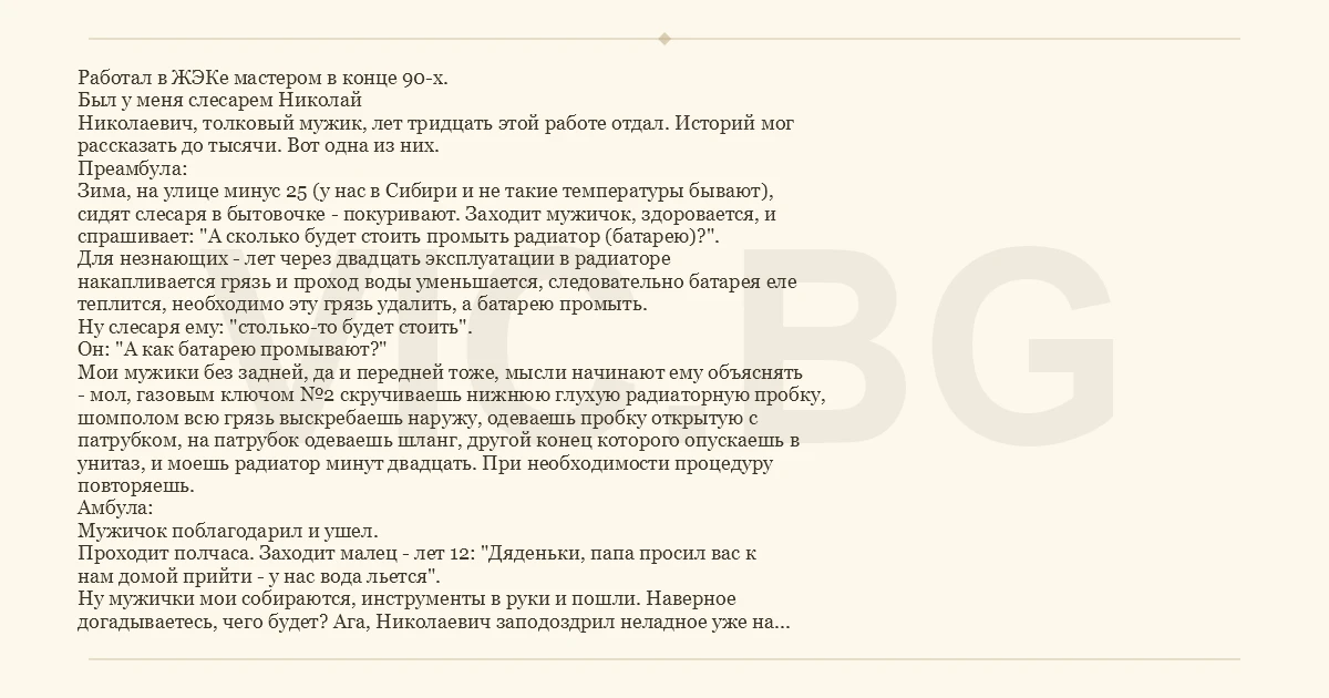 Работал в ЖЭКе мастером в конце 90-х. Был у меня слесарем Николай Николаевич, толковый мужик, лет тридцать этой работе отдал. Историй мог рассказать до тысячи. Вот одна из них. Преамбула: Зима, на улице минус 25 (у нас в Сибири и не такие температуры бывают), сидят слесаря в бытовочке - покуривают. Заходит мужичок, здоровается, и спрашивает: "А сколько будет стоить промыть радиатор (батарею)?". Для незнающих - лет через двадцать эксплуатации в радиаторе накапливается грязь и проход воды уменьшается, следовательно батарея еле теплится, необходимо эту грязь удалить, а батарею промыть. Ну слесаря ему: "столько-то будет стоить". Он: "А как батарею промывают?" Мои мужики без задней, да и передней тоже, мысли начинают ему объяснять - мол, газовым ключом №2 скручиваешь нижнюю глухую радиаторную пробку, шомполом всю грязь выскребаешь наружу, одеваешь пробку открытую с патрубком, на патрубок одеваешь шланг, другой конец которого опускаешь в унитаз, и моешь радиатор минут двадцать. При необходимости процедуру повторяешь. Амбула: Мужичок поблагодарил и ушел. Проходит полчаса. Заходит малец - лет 12: "Дяденьки, папа просил вас к нам домой прийти - у нас вода льется". Ну мужички мои собираются, инструменты в руки и пошли. Наверное догадываетесь, чего будет? Ага, Николаевич заподоздрил неладное уже на подходе к дому. Из одного подъезда парило так, что вытянутую руку не видно (повторюсь, на улице - 25С, температура теплоносителя около +100С). При входе в подъезд обнаружена новая "Ниагара" - вода льется сплошным потоком. Но самое интересное и смешное ждало на кухне квартиры: давешний мужичок орет благим матом, в это же время упирается руками в стену кухни, а, внимание!!! , БОСОЙ ПЯТКОЙ - да, да, пытается закрыть хлещущий кипяток из открытой секции радиатора, пятка уже почти черная. В тот момент конечно никто не смеялся, быстренько воду перекрыли, все на место завинтили, мужичку скорую вызвали. А уж потом и посмеялись. Спрашивают его:"ты на кой полез к радиатору, не отключив стояк?". Ну я же говорю, без задней мысли они ему в двух словах объяснили принцип промывки, а то что перед работой стояк отключать надо - это любой слесарь знает. Мораль: каждый должен заниматься своим делом, люди оставтьте радиаторы - слесарям.