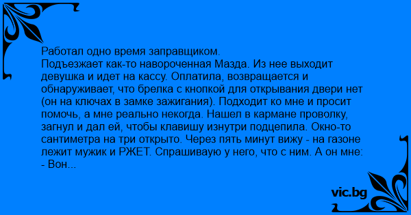 Подъезжает как-то навороченная Мазда. Из нее выходит девушка и идет на кассу. Оплатила, возвращается и обнаруживает, что брелка с кнопкой для открывания двери нет (он на ключах в замке зажигания). Подходит ко мне и просит помочь, а мне реально некогда. Нашел в кармане проволку, загнул и дал ей, чтобы клавишу изнутри подцепила. Окно-то сантиметра на три открыто. Через пять минут вижу - на газоне лежит мужик и РЖЕТ. Спрашиваую у него, что с ним. А он мне: