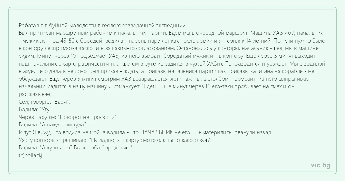 Работал я в буйной молодости в геологоразведочной экспедиции. Был приписан маршрутным рабочим к начальнику партии. Едем мы в очередной маршрут. Машина УАЗ-469, начальник - мужик лет под 45-50 с бородой, водила - парень пару лет как после армии и я - сопляк 14-летний. По пути нужно было в контору леспромхоза заскочить за каким-то согласованием. Остановились у конторы, начальник ушел, мы в машине сидим. Минут через 10 подъезжает УАЗ, из него выходит бородатый мужик и - в контору. Еще через 5 минут выходит наш начальник с картографическим планшетом в руке и.. садится в чужой УАЗик. Тот заводится и уезжает. Мы с водилой в ахуе, чего делать не ясно. Был приказ - ждать, а приказы начальника партии как приказы капитана на корабле - не обсуждают. Еще через 5 минут смотрим УАЗ возвращается, летит аж пыль столбом. Тормозит, из него выпрыгивает начальник, садится в нашу машину и командует: "Едем". Еще минут через 10 его-таки пробивает на смех и он рассказывает. Сел, говорю: "Едем". Водила: "Угу". Через пару км: "Поворот не проскочи". Водила: "А нахуя нам туда?" И тут Я вижу, что водила не мой, а водила - что НАЧАЛЬНИК не его... Выматерились, рванули назад. Уже у конторы спрашиваю: "Ну ладно, я в карту смотрю, а ты то какого хуя?" Водила: "А хули я-то? Вы же оба бородатые!" (с)pollackj