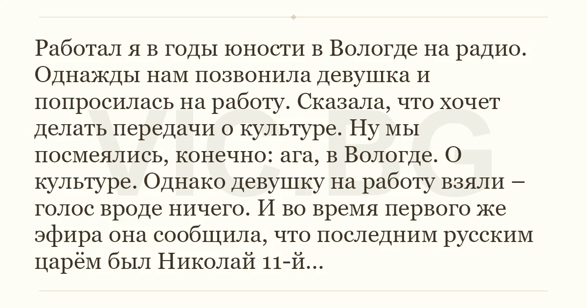 Работал я в годы юности в Вологде на радио. Однажды нам позвонила девушка и попросилась на работу. Сказала, что хочет делать передачи о культуре. Ну мы посмеялись, конечно: ага, в Вологде. О культуре. Однако девушку на работу взяли – голос вроде ничего. И во время первого же эфира она сообщила, что последним русским царём был Николай 11-й…