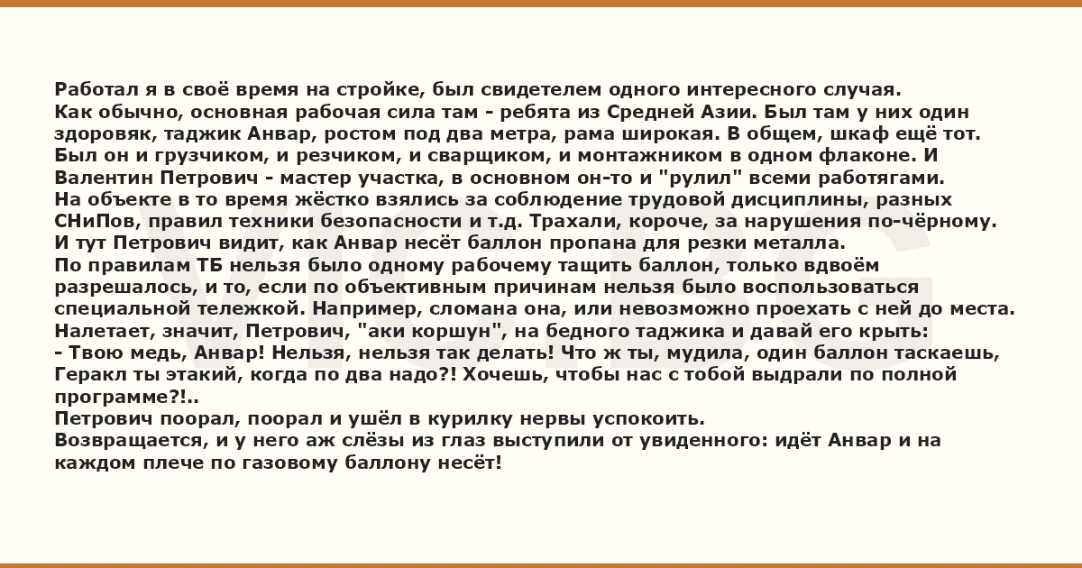 Работал я в своё время на стройке, был свидетелем одного интересного случая. Как обычно, основная рабочая сила там - ребята из Средней Азии. Был там у них один здоровяк, таджик Анвар, ростом под два метра, рама широкая. В общем, шкаф ещё тот. Был он и грузчиком, и резчиком, и сварщиком, и монтажником в одном флаконе. И Валентин Петрович - мастер участка, в основном он-то и "рулил" всеми работягами. На объекте в то время жёстко взялись за соблюдение трудовой дисциплины, разных СНиПов, правил техники безопасности и т.д. Трахали, короче, за нарушения по-чёрному. И тут Петрович видит, как Анвар несёт баллон пропана для резки металла. По правилам ТБ нельзя было одному рабочему тащить баллон, только вдвоём разрешалось, и то, если по объективным причинам нельзя было воспользоваться специальной тележкой. Например, сломана она, или невозможно проехать с ней до места. Налетает, значит, Петрович, "аки коршун", на бедного таджика и давай его крыть: - Твою медь, Анвар! Нельзя, нельзя так делать! Что ж ты, мудила, один баллон таскаешь, Геракл ты этакий, когда по два надо?! Хочешь, чтобы нас с тобой выдрали по полной программе?!.. Петрович поорал, поорал и ушёл в курилку нервы успокоить. Возвращается, и у него аж слёзы из глаз выступили от увиденного: идёт Анвар и на каждом плече по газовому баллону несёт!