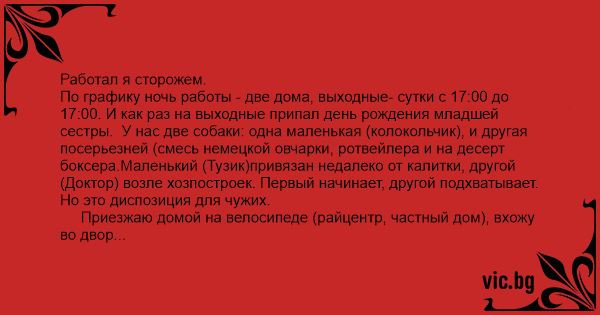 По графику ночь работы - две дома, выходные- сутки с 17:00 до 17:00. И как раз на выходные припал день рождения младшей сестры. У нас две собаки: одна маленькая (колокольчик), и другая посерьезней (смесь немецкой овчарки, ротвейлера и на десерт боксера.Маленький (Тузик)привязан недалеко от калитки, другой (Доктор) возле хозпостроек. Первый начинает, другой подхватывает. Но это диспозиция для чужих.