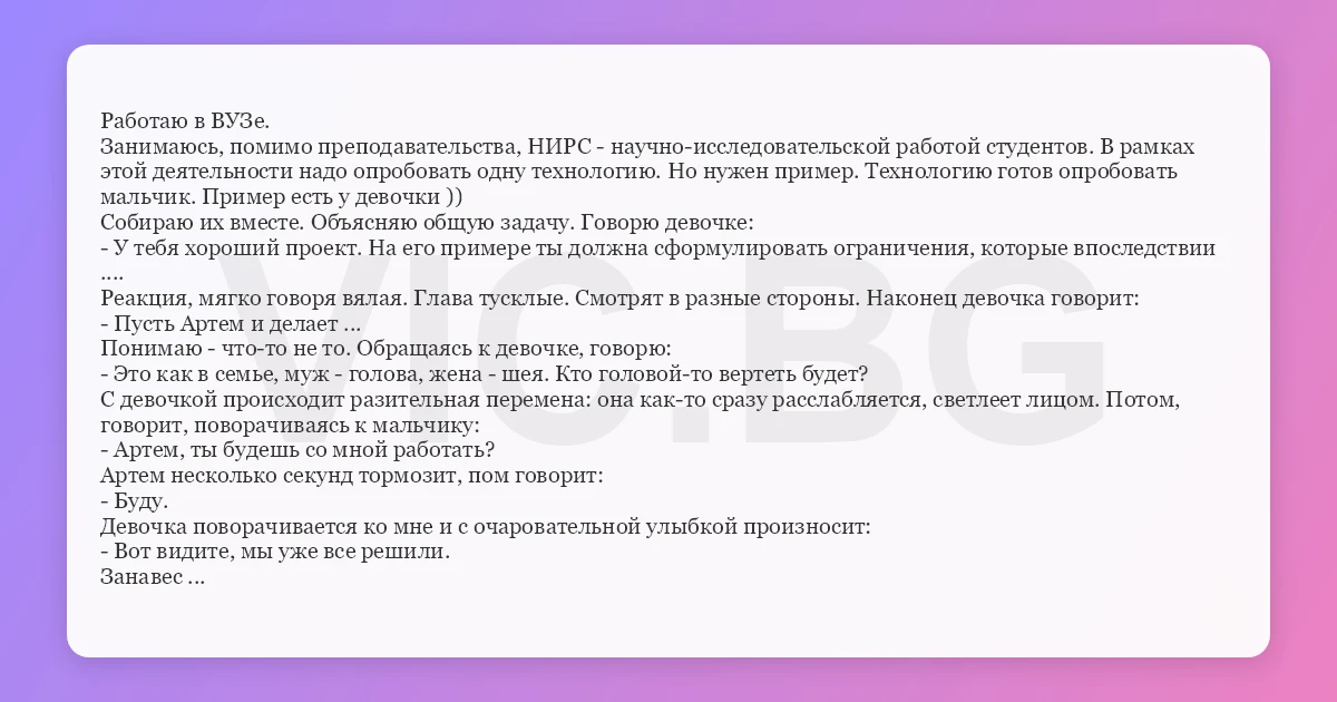 Занимаюсь, помимо преподавательства, НИРС - научно-исследовательской работой студентов. В рамках этой деятельности надо опробовать одну технологию. Но нужен пример. Технологию готов опробовать мальчик. Пример есть у девочки ))