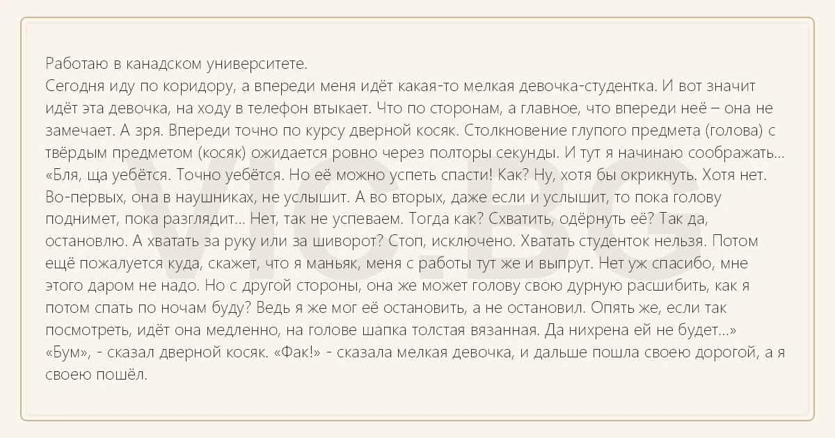Работаю в канадском университете. Сегодня иду по коридору, а впереди меня идёт какая-то мелкая девочка-студентка. И вот значит идёт эта девочка, на ходу в телефон втыкает. Что по сторонам, а главное, что впереди неё – она не замечает. А зря. Впереди точно по курсу дверной косяк. Столкновение глупого предмета (голова) с твёрдым предметом (косяк) ожидается ровно через полторы секунды. И тут я начинаю соображать… «Бля, ща уебётся. Точно уебётся. Но её можно успеть спасти! Как? Ну, хотя бы окрикнуть. Хотя нет. Во-первых, она в наушниках, не услышит. А во вторых, даже если и услышит, то пока голову поднимет, пока разглядит… Нет, так не успеваем. Тогда как? Схватить, одёрнуть её? Так да, остановлю. А хватать за руку или за шиворот? Стоп, исключено. Хватать студенток нельзя. Потом ещё пожалуется куда, скажет, что я маньяк, меня с работы тут же и выпрут. Нет уж спасибо, мне этого даром не надо. Но с другой стороны, она же может голову свою дурную расшибить, как я потом спать по ночам буду? Ведь я же мог её остановить, а не остановил. Опять же, если так посмотреть, идёт она медленно, на голове шапка толстая вязанная. Да нихрена ей не будет…» «Бум», - сказал дверной косяк. «Фак!» - сказала мелкая девочка, и дальше пошла своею дорогой, а я своею пошёл.