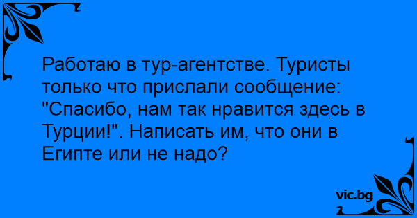 Работаю в тур-агентстве. Туристы только что прислали сообщение: "Спасибо, нам так нравится здесь в Турции!". Написать им, что они в Египте или не надо?