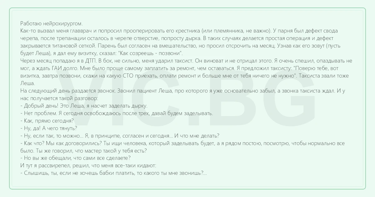 Работаю нейрохирургом. Как-то вызвал меня главврач и попросил прооперировать его крестника (или племянника, не важно). У парня был дефект свода черепа, после трепанации осталось в черепе отверстие, попросту дырка. В таких случаях делается простая операция и дефект закрывается титановой сеткой. Парень был согласен на вмешательство, но просил отсрочить на месяц. Узнав как его зовут (пусть будет Леша), я дал ему визитку, сказал: "Как созреешь - позвони". Через месяц попадаю я в ДТП. В бок, не сильно, меня ударил таксист. Он виноват и не отрицал этого. Я очень спешил, опаздывать не мог, а ждать ГАИ долго. Мне было проще самому заплатить за ремонт, чем оставаться. Я предложил таксисту: "Поверю тебе, вот визитка, завтра позвони, скажи на какую СТО приехать, оплати ремонт и больше мне от тебя ничего не нужно". Таксиста звали тоже Леша. На следующий день раздается звонок. Звонил пациент Леша, про которого я уже основательно забыл, а звонка таксиста ждал. И у нас получается такой разговор: - Добрый день! Это Леша, я насчет заделать дырку. - Нет проблем. Я сегодня освобождаюсь после трех, давай будем заделывать. - Как, прямо сегодня? - Ну, да! А чего тянуть? - Ну, если так, то можно... Я, в принципе, согласен и сегодня... И что мне делать? - Как что? Мы как договорились? Ты ищи человека, который заделывать будет, а я рядом постою, посмотрю, чтобы нормально все было. Ты же говорил, что мастер такой у тебя есть? - Но вы же обещали, что сами все сделаете? И тут я рассвирепел, решил, что меня все-таки кидают: - Слышишь, ты, если не хочешь бабки платить, то какого ты мне звонишь? - Да я заплачу, сколько вы скажете, только я хочу, чтобы вы сделали все сами! - Черт с тобой, давай так... Но, я не знаю сколько это обойдется - шпаклевка, краска... - Какая шпаклевка, какая краска??? Вы про какую-то сеточку из титана говорили... И тут до меня дошло... P.S. Операция прошла отлично. P.P.S. Таксист так и не позвонил...