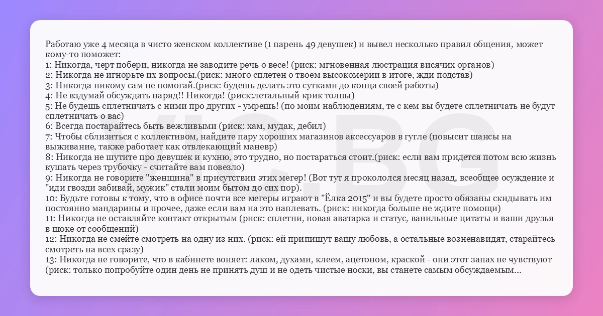 Работаю уже 4 месяца в чисто женском коллективе (1 парень 49 девушек) и вывел несколько правил общения, может кому-то поможет: