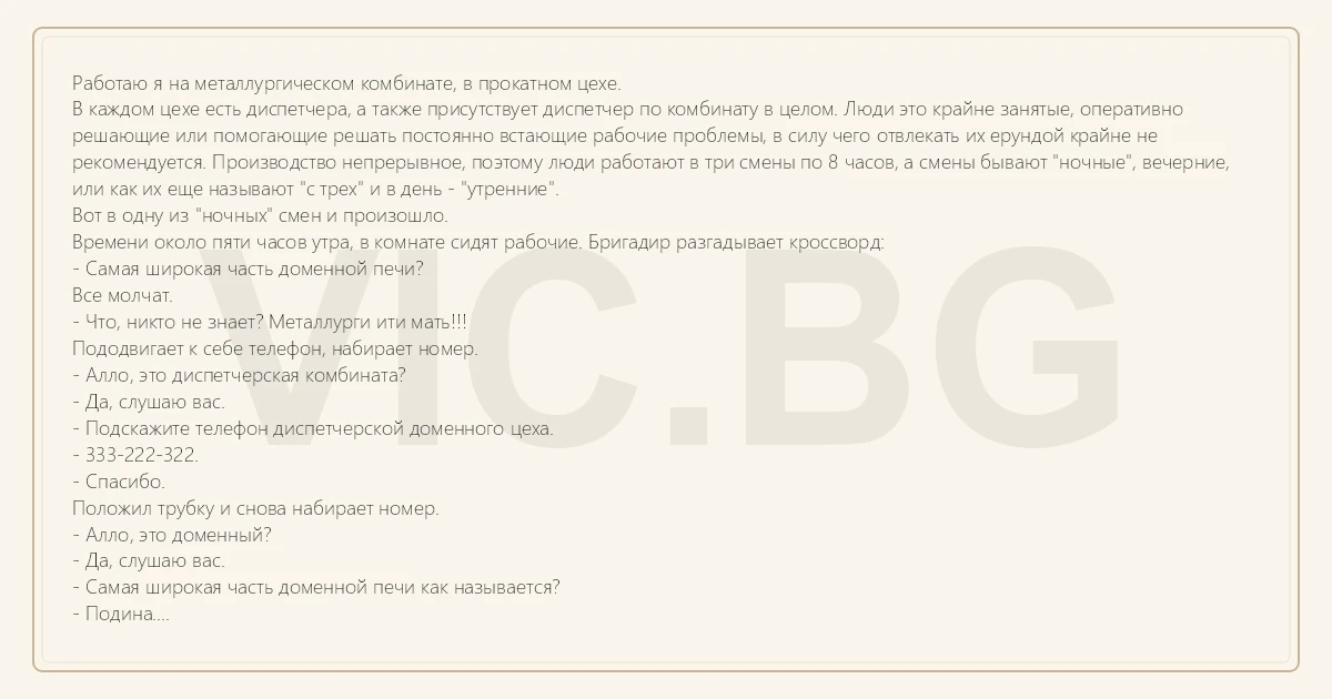 Работаю я на металлургическом комбинате, в прокатном цехе. В каждом цехе есть диспетчера, а также присутствует диспетчер по комбинату в целом. Люди это крайне занятые, оперативно решающие или помогающие решать постоянно встающие рабочие проблемы, в силу чего отвлекать их ерундой крайне не рекомендуется. Производство непрерывное, поэтому люди работают в три смены по 8 часов, а смены бывают "ночные", вечерние, или как их еще называют "с трех" и в день - "утренние". Вот в одну из "ночных" смен и произошло. Времени около пяти часов утра, в комнате сидят рабочие. Бригадир разгадывает кроссворд: - Самая широкая часть доменной печи? Все молчат. - Что, никто не знает? Металлурги ити мать!!! Пододвигает к себе телефон, набирает номер. - Алло, это диспетчерская комбината? - Да, слушаю вас. - Подскажите телефон диспетчерской доменного цеха. - 333-222-322. - Спасибо. Положил трубку и снова набирает номер. - Алло, это доменный? - Да, слушаю вас. - Самая широкая часть доменной печи как называется? - Подина. - Подождите. Вписывает слово в клеточки. - Подошло. - В смысле? - Да мы тут кроссворд разгадываем. - ППЦ!)))Металлурги!
