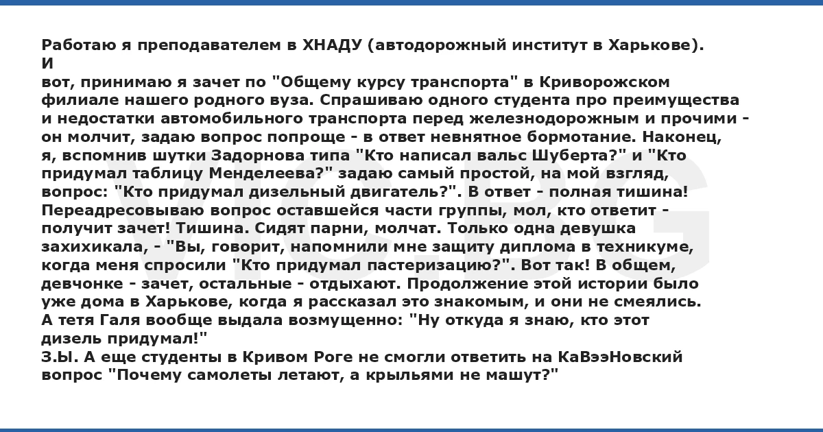 Работаю я преподавателем в ХНАДУ (автодорожный институт в Харькове). И вот, принимаю я зачет по "Общему курсу транспорта" в Криворожском филиале нашего родного вуза. Спрашиваю одного студента про преимущества и недостатки автомобильного транспорта перед железнодорожным и прочими - он молчит, задаю вопрос попроще - в ответ невнятное бормотание. Наконец, я, вспомнив шутки Задорнова типа "Кто написал вальс Шуберта?" и "Кто придумал таблицу Менделеева?" задаю самый простой, на мой взгляд, вопрос: "Кто придумал дизельный двигатель?". В ответ - полная тишина! Переадресовываю вопрос оставшейся части группы, мол, кто ответит - получит зачет! Тишина. Сидят парни, молчат. Только одна девушка захихикала, - "Вы, говорит, напомнили мне защиту диплома в техникуме, когда меня спросили "Кто придумал пастеризацию?". Вот так! В общем, девчонке - зачет, остальные - отдыхают. Продолжение этой истории было уже дома в Харькове, когда я рассказал это знакомым, и они не смеялись. А тетя Галя вообще выдала возмущенно: "Ну откуда я знаю, кто этот дизель придумал!" З.Ы. А еще студенты в Кривом Роге не смогли ответить на КаВээНовский вопрос "Почему самолеты летают, а крыльями не машут?"