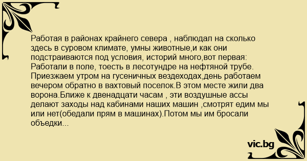 Работали в поле, тоесть в лесотундре на нефтяной трубе. Приезжаем утром на гусеничных вездеходах,день работаем вечером обратно в вахтовый поселок.В этом месте жили два ворона.Ближе к двенадцати часам , эти воздушные ассы делают заходы над кабинами наших машин ,смотрят едим мы или нет(обедали прям в машинах).Потом мы им бросали объедки просто на землю.Они это всё собирали и с карканьем улетали. Потом мы стали собирать объедки в два пакета и стали ставить прям па нефтяную трубу. Высота трубы над землей два метра в среднем.Так эти месершмиты так поднаторели в летном искустве , что эти пакеты схватывали с лёту , уносили и потом уже спокойно разбирались с содержимым.