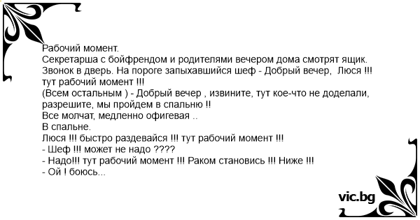 Рабочий момент. Секретарша с бойфрендом и родителями вечером дома смотрят ящик. Звонок в дверь. На пороге запыхавшийся шеф - Добрый вечер, Люся !!! тут рабочий момент !!! (Всем остальным ) - Добрый вечер , извините, тут кое-что не доделали, разрешите, мы пройдем в спальню !! Все молчат, медленно офигевая .. В спальне. Люся !!! быстро раздевайся !!! тут рабочий момент !!! - Шеф !!! может не надо ???? - Надо!!! тут рабочий момент !!! Раком становись !!! Ниже !!! - Ой ! боюсь ... - Не бойся ! тут рабочий момент !!! - Шеф !! может не надо ?? - Надо !! Где у вас тут свет !!! Вот... 479 - 45 - 68.. я ж тут у тебя сзади телефон записал,а потом забыл в еженедельник переписать, а позвонить сейчас надо. - Все .. все.. до свиданья .. До свиданья ! Выходит в гостиную. (Всем остальным ) Работа .. , разрешите откланятся..!! Все молчат.