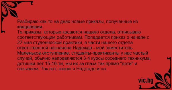 Маленькое отступление: студенты-практиканты у нас частый случай, обычно направляются 3-4 курсы соседнего техникума, детишки лет 15-16-ти, мы их за глаза так прямо "дети" и называем. Так вот, звоню я Надежде и на автопилоте сообщаю: Надежда, к 22 мая у нас с тобой должны быть "дети".