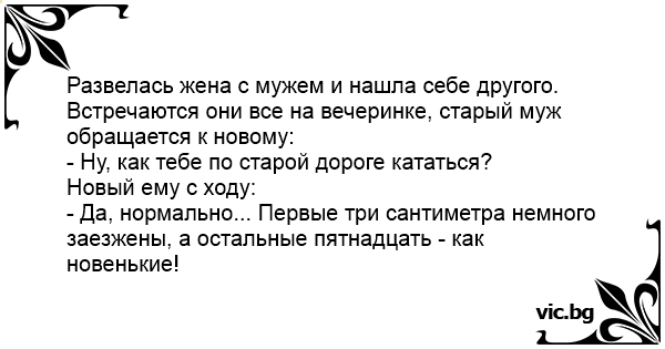 Развелась жена с мужем и нашла себе другого. Встречаются они все на вечеринке, старый муж обращается к новому: