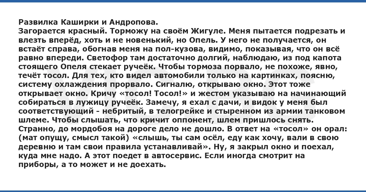 Развилка Каширки и Андропова. Загорается красный. Торможу на своём Жигуле. Меня пытается подрезать и влезть вперёд, хоть и не новенький, но Опель. У него не получается, он встаёт справа, обогнав меня на пол-кузова, видимо, показывая, что он всё равно впереди. Светофор там достаточно долгий, наблюдаю, из под капота стоящего Опеля стекает ручеёк. Чтобы тормоза порвало, не похоже, явно, течёт тосол. Для тех, кто видел автомобили только на картинках, поясню, систему охлаждения прорвало. Сигналю, открываю окно. Этот тоже открывает окно. Кричу «тосол! Тосол!» и жестом указываю на начинающий собираться в лужицу ручеёк. Замечу, я ехал с дачи, и видок у меня был соответствующий - небритый, в телогрейке и стыренном из армии танковом шлеме. Чтобы слышать, что кричит оппонент, шлем пришлось снять. Странно, до мордобоя на дороге дело не дошло. В ответ на «тосол» он орал: (мат опущу, смысл такой) «слышь, ты сам осёл, еду как хочу, вали в свою деревню и там свои правила устанавливай». Ну, я закрыл окно и поехал, куда мне надо. А этот поедет в автосервис. Если иногда смотрит на приборы, а то может и не доехать.