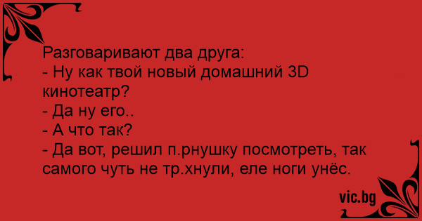 Разговаривают два друга: - Ну как твой новый домашний 3D кинотеатр? - Да ну его.. - А что так? - Да вот, решил п.рнyшкy посмотреть, так самого чуть не тр.хнyли, еле ноги унёс.
