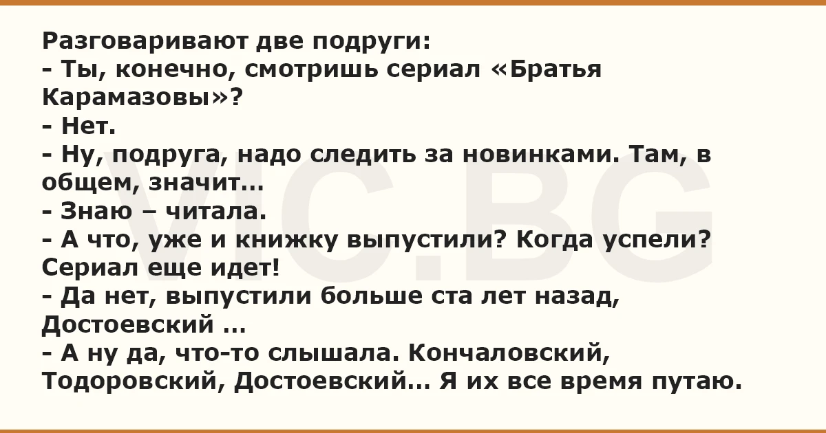 Разговаривают две подруги: - Ты, конечно, смотришь сериал «Братья Карамазовы»? - Нет. - Ну, подруга, надо следить за новинками. Там, в общем, значит… - Знаю – читала. - А что, уже и книжку выпустили? Когда успели? Сериал еще идет! - Да нет, выпустили больше ста лет назад, Достоевский … - А ну да, что-то слышала. Кончаловский, Тодоровский, Достоевский… Я их все время путаю.