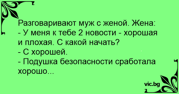 Перничиња Καλή και κακή είδηση Жена звъни на мъжа си: Жена звонит мужу на работу, чтобы поболтать. Муж: Un niño llega a casa y le dice al padre: - Papá tengo que darte dos noticias, una buena y otra mala, ¿cuál quieres primero?. Y el padre le contesta: - Hijo dame sólo la buena porque hoy he tenido un día malísimo y no quiero más problemas, otro día ya me dirás la mala. Y el hijo le contesta: -... Die Ehefrau kommt nach Hause und sagt dem Ehemann: "Ich habe eine gute und eine schlechte Nachricht. Welche willst du zuerst hören?" Na die gute! Also ... Der Airbag hat funktioniert! 's Ochtends gaat Yolanthe uit rijden met de spiksplinternieuwe auto van Wesley. Als Wesley 's avonds thuiskomt, zegt Yolanthe: 'Ik heb goed en slecht nieuws. Ik begin maar met het goede nieuws: de... När frun kommer hem säger hon till sin man: - Jag har en god och en dålig nyhet, vilken vill du höra först? - Vi kan väl ta den goda, svarade mannen. - Airbagen fungerade... A mulher de um advogado liga para ele no meio de uma reunião de negócios e diz: — Amor eu tenho uma notícia boa e uma ruim. — Mas amor, eu estou em uma reunião de negócios, então fale só a boa. —... Llega la hija como a las 2 de mañana y le dice al padre que la está esperando despierto,"Papá tengo dos noticias una buena y otra mala ". El padre le contesta: "dime la buena noticia primero" La... - Pappa, jeg har en god og en dårlig nyhet! - Jeg er litt opptatt nå, men la meg høre bare den gode! - Airbagen virket! A mulher liga para o marido e fala: "Querido tenho duas notícias para te dar, uma boa e uma ruim" E o marido responde: "Olha, eu estou numa reunião super tensa, me diz só a boa" E a mulher diz:... Een man is op zakenreis in Japan wanneer zijn vrouw hem belt. Hij neemt op met: "Kun je heel kort houden? Dit telefoontje is enorm duur." De vrouw begint met: "Ik heb goed nieuws en slecht... La niña rubia al fin se ha sacado el carnet de conducir y toca estrenar el coche nuevo que le han regalado. Tras una vueltas por el día, se lo decide llevar de fiesta a la noche. A las 2 de la... Mariano, te tengo que dar dos noticias, una buena y otra mala. Ya estoy harto de noticias malas, dime sólo la buena. Que el airbag del coche funciona. Vaimo tulee kotiin ja antaa autonavaimet miehelle kertoen: - Minulla on sekä hyviä että huonoja uutisia. Kummat kerron ensin? - No, vaikkapa ne hyvät. - Auton turvatyyny toimii Дружина дзвонить чоловіку на роботу, щоб поговорити. Чоловік: — Вибач, люба, але в мене зараз роботи багато. — Але, милий, у мене є для тебе новини: хороша і погана. — Гаразд, у мене немає часу... Soţia vine acasă şi-i zice soţului: - Am o veste bună şi una rea , pe care s-o zic? - Zi-o pe`aia bună, zice soţul. - Merg airbagurile!!! Az ifjú feleség új autót kap születésnapjára. Rögtön el is viszi egy körre, hogy kipróbálja. Sokára ér haza, majd az ajtón belépve azt mondja a férjének: - Drágám, az új autóval kapcsolatban van... Hej, skat, det er mig. Jeg har en god og en dårlig nyhed. - Du, jeg har lige lidt travlt. Nøjes med at fortælle mig den gode. - OK, bilens airbags virker fint. Este hazamegy a feleség, és így szól a férjéhez: - Drágám, van egy jó és egy rossz hírem. Melyiket mondjam előbb? - A jót. - Működött a légzsák! Une femme revient de son shopping avec la Mercedes de son mari . Elle s’écrie : - Chéri, j’ai une bonne nouvelle. Ton airbag, côté conducteur, fonctionne à merveille ! Konen ringede til sin mand på arbejdet. - Hej skat. Hvordan går det? - Det går fint, men jeg har travlt og har ikke tid til hyggesnak nu. - Hmm..... Jeg har ellers både en god og en dårlig nyhed. -...