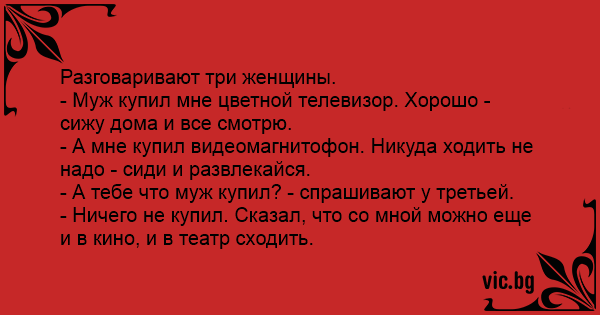 - Муж купил мне цветной телевизор. Хорошо - сижу дома и все смотрю.