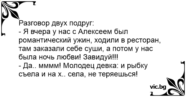 - Я вчера у нас с Алексеем был романтический ужин, ходили в ресторан, там заказали себе суши, а потом у нас была ночь любви! Завидуй!!!