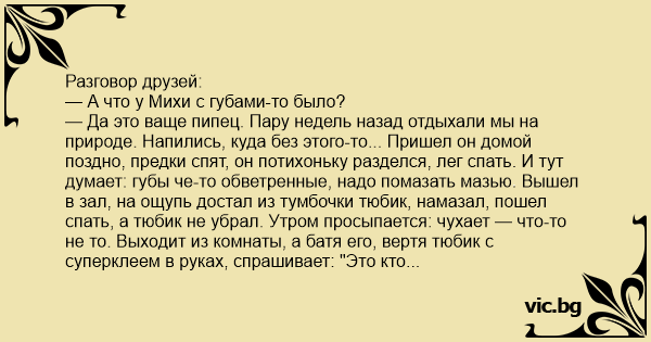 Разговор друзей: — А что у Михи с губами-то было? — Да это ваще пипец. Пару недель назад отдыхали мы на природе. Напились, куда без этого-то... Пришел он домой поздно, предки спят, он потихоньку разделся, лег спать. И тут думает: губы че-то обветренные, надо помазать мазью. Вышел в зал, на ощупь достал из тумбочки тюбик, намазал, пошел спать, а тюбик не убрал. Утром просыпается: чухает — что-то не то. Выходит из комнаты, а батя его, вертя тюбик с суперклеем в руках, спрашивает: "Это кто здесь оставил его? " А Миха рот открыть не может... Батя его смотрит секунд 10 на Миху — и как давай ржать! . . Вызвали "скорую". Не поедешь же в таком виде по городу. Миха лег, глаза закрыл. Тут подходит его малой брат и решил перышком от подушки пощекотать ему нос... — Упс... А дальше-то что? — Что дальше... Дальше Миха чихнул... — Все... бросаю пить. — Я тоже бросил...