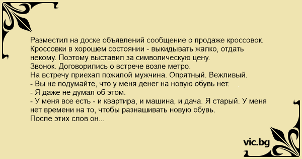 Разместил на доске объявлений сообщение о продаже кроссовок. Кроссовки в хорошем состоянии - выкидывать жалко, отдать некому. Поэтому выставил за символическую цену.