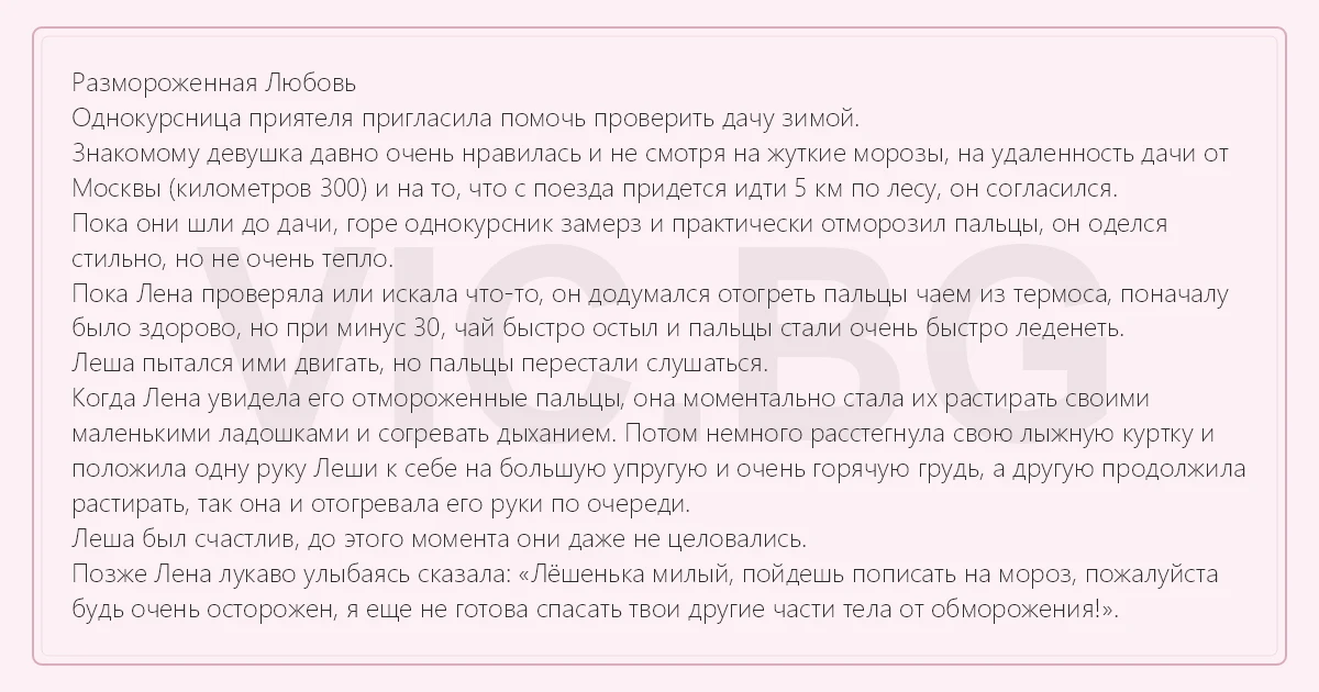 Размороженная Любовь Однокурсница приятеля пригласила помочь проверить дачу зимой. Знакомому девушка давно очень нравилась и не смотря на жуткие морозы, на удаленность дачи от Москвы (километров 300) и на то, что с поезда придется идти 5 км по лесу, он согласился. Пока они шли до дачи, горе однокурсник замерз и практически отморозил пальцы, он оделся стильно, но не очень тепло. Пока Лена проверяла или искала что-то, он додумался отогреть пальцы чаем из термоса, поначалу было здорово, но при минус 30, чай быстро остыл и пальцы стали очень быстро леденеть. Леша пытался ими двигать, но пальцы перестали слушаться. Когда Лена увидела его отмороженные пальцы, она моментально стала их растирать своими маленькими ладошками и согревать дыханием. Потом немного расстегнула свою лыжную куртку и положила одну руку Леши к себе на большую упругую и очень горячую грудь, а другую продолжила растирать, так она и отогревала его руки по очереди. Леша был счастлив, до этого момента они даже не целовались. Позже Лена лукаво улыбаясь сказала: «Лёшенька милый, пойдешь пописать на мороз, пожалуйста будь очень осторожен, я еще не готова спасать твои другие части тела от обморожения!».