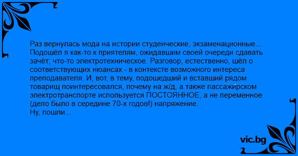 Раз вернулась мода на истории студенческие, экзаменационные... Подошёл я как-то к приятелям, ожидавшим своей очереди сдавать зачёт; что-то электротехническое. Разговор, естественно, шёл о соответствующих нюансах - в контексте возможного интереса преподавателя. И, вот, в тему, подошедший и вставший рядом товарищ поинтересовался, почему на ж/д, а также пассажирском электротранспорте используется ПОСТОЯННОЕ, а не переменное (дело было в середине 70-х годов!) напряжение. Ну, пошли реплики-предположения, в основном связанные с помехами, с потерями и т.д. Мною же была высказана мысль о тяговом моменте при включении - каковая тут-же была товарищем одобрена! После чего он потребовал мою зачётку - для регистрации успешной сдачи зачёта... А я был с другого потока, и мне этот зачёт сдавать было не надо.
