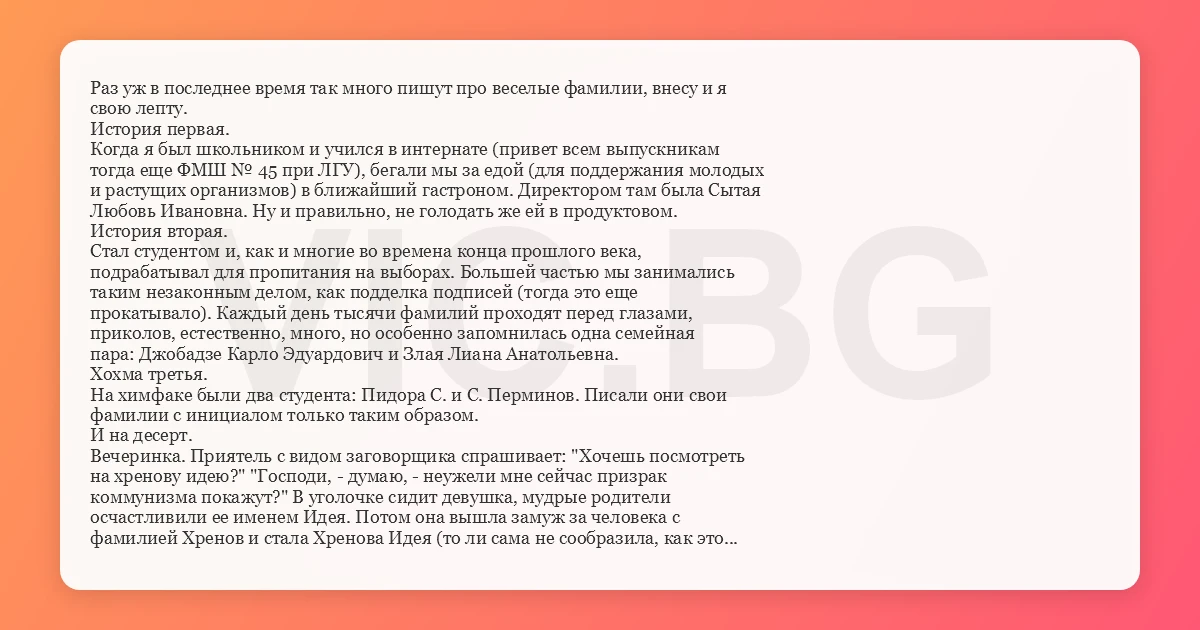 Раз уж в последнее время так много пишут про веселые фамилии, внесу и я свою лепту. История первая. Когда я был школьником и учился в интернате (привет всем выпускникам тогда еще ФМШ № 45 при ЛГУ), бегали мы за едой (для поддержания молодых и растущих организмов) в ближайший гастроном. Директором там была Сытая Любовь Ивановна. Ну и правильно, не голодать же ей в продуктовом. История вторая. Стал студентом и, как и многие во времена конца прошлого века, подрабатывал для пропитания на выборах. Большей частью мы занимались таким незаконным делом, как подделка подписей (тогда это еще прокатывало). Каждый день тысячи фамилий проходят перед глазами, приколов, естественно, много, но особенно запомнилась одна семейная пара: Джобадзе Карло Эдуардович и Злая Лиана Анатольевна. Хохма третья. На химфаке были два студента: Пидора С. и С. Перминов. Писали они свои фамилии с инициалом только таким образом. И на десерт. Вечеринка. Приятель с видом заговорщика спрашивает: "Хочешь посмотреть на хренову идею?" "Господи, - думаю, - неужели мне сейчас призрак коммунизма покажут?" В уголочке сидит девушка, мудрые родители осчастливили ее именем Идея. Потом она вышла замуж за человека с фамилией Хренов и стала Хренова Идея (то ли сама не сообразила, как это вместе звучать будет, то ли муж принципиальный - моя жена должна носить мою фамилию, а, может, у них просто чувство юмора такое специфическое)