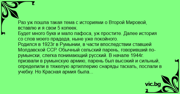 Раз уж пошла такая тема с историями о Второй Мировой, вставлю и я свои 5 копеек.