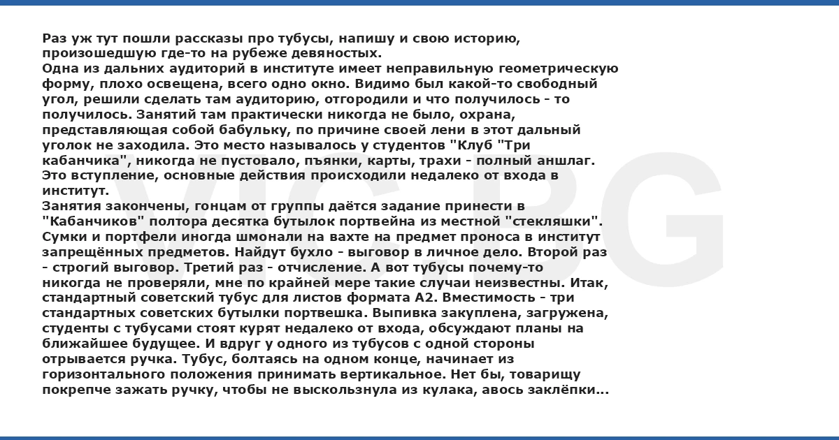 Раз уж тут пошли рассказы про тубусы, напишу и свою историю, произошедшую где-то на рубеже девяностых. Одна из дальних аудиторий в институте имеет неправильную геометрическую форму, плохо освещена, всего одно окно. Видимо был какой-то свободный угол, решили сделать там аудиторию, отгородили и что получилось - то получилось. Занятий там практически никогда не было, охрана, представляющая собой бабульку, по причине своей лени в этот дальный уголок не заходила. Это место называлось у студентов "Клуб "Три кабанчика", никогда не пустовало, пъянки, карты, трахи - полный аншлаг. Это вступление, основные действия происходили недалеко от входа в институт. Занятия закончены, гонцам от группы даётся задание принести в "Кабанчиков" полтора десятка бутылок портвейна из местной "стекляшки". Сумки и портфели иногда шмонали на вахте на предмет проноса в институт запрещённых предметов. Найдут бухло - выговор в личное дело. Второй раз - строгий выговор. Третий раз - отчисление. А вот тубусы почему-то никогда не проверяли, мне по крайней мере такие случаи неизвестны. Итак, стандартный советский тубус для листов формата A2. Вместимость - три стандартных советских бутылки портвешка. Выпивка закуплена, загружена, студенты с тубусами стоят курят недалеко от входа, обсуждают планы на ближайшее будущее. И вдруг у одного из тубусов c одной стороны отрывается ручка. Тубус, болтаясь на одном конце, начинает из горизонтального положения принимать вертикальное. Нет бы, товарищу покрепче зажать ручку, чтобы не выскользнула из кулака, авось заклёпки на неоторвавшейся части выдержали бы. Но он, не ожидав наддого происшествия, наоборот выпустил ручку и обеими руками попытался перехватить тубус за основание. Не поймал. Тубус приземляется на асфальт в положении готовой к взлёту ракеты. ЦЗЫНЬ! ПХК! "Верхняя" бутылка разбивает горлышком дно "средней", "средняя" в свою очередь разбивает дно "нижней". Виновным в таких ситуацтях всегда является тот, кто на момент "ДЗЫНЬ" держал в руках "общественное достояние". И тогда его наказывают синяком под глазом и покупкой утраченного за счёт своей стипендии. Может в будущем с главным героем так и поступили. Но кульминация момента такова: моментально осознавшие, что произошло, студенты подхватывают тубус, открывают, выкидывают оттуда на асвальт испорченые чертежи, бережно вынимают уцелевшую "верхнюю" бутылку и крупные осколки. Всё это сопровождается словами, которые в книгах писать не принято. Затем кто-то находит чистый носовой платок, обматывает им горловину тубуса (чтобы битое стекло отфильтровать) и этот "кубок" пускается по кругу. Каждый, наклоняя тубус и стараясь не уронить ни капли, сквозь носовой платок делает по паре глотков драгоценного напитка. P.S. Тубус не пострадал, я его ещё не раз потом видел, а вот чертежи бедняге очевидно переделывать пришлось.