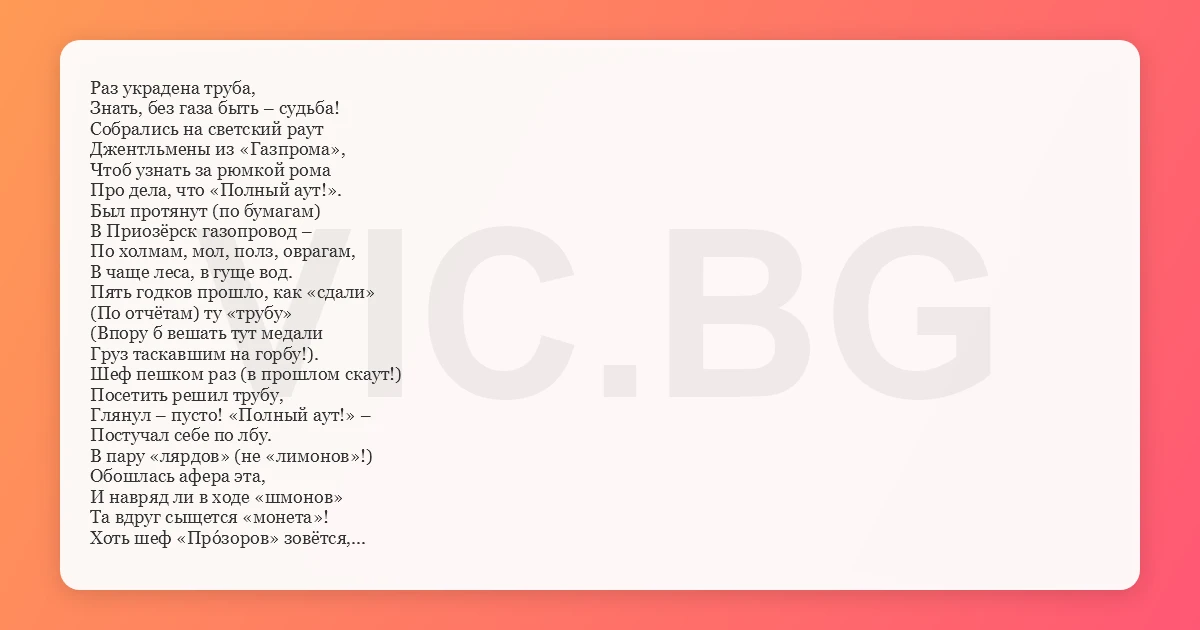 Раз украдена труба, Знать, без газа быть – судьба! Собрались на светский раут Джентльмены из «Газпрома», Чтоб узнать за рюмкой рома Про дела, что «Полный аут!». Был протянут (по бумагам) В Приозёрск газопровод – По холмам, мол, полз, оврагам, В чаще леса, в гуще вод. Пять годков прошло, как «сдали» (По отчётам) ту «трубу» (Впору б вешать тут медали Груз таскавшим на горбу!). Шеф пешком раз (в прошлом скаут!) Посетить решил трубу, Глянул – пусто! «Полный аут!» – Постучал себе по лбу. В пару «лярдов» (не «лимонов»!) Обошлась афера эта, И навряд ли в ходе «шмонов» Та вдруг сыщется «монета»! Хоть шеф «Прóзоров» зовётся, «Прозорливый» – не о нём! Там ворам легко живётся, Где не видят днём с огнём! 7 марта 2019 Член правления ПАО "Газпром" Сергей Прозоров назвал "полным аутом" ситуацию с газопроводом в городе Приозёрск Ленинградской области. На закрытом совещании он резко раскритиковал своих подчинённых из-за ситуации с «пропавшей» газовой трубой стоимостью 1,7 млрд рублей. («Врёте, сволочи!»). О пропаже целого газопровода в области стало известно ещё в 2017 году, однако компания долгое время это напрочь отрицала. В конце 2018 года о проблеме рассказали президенту России.