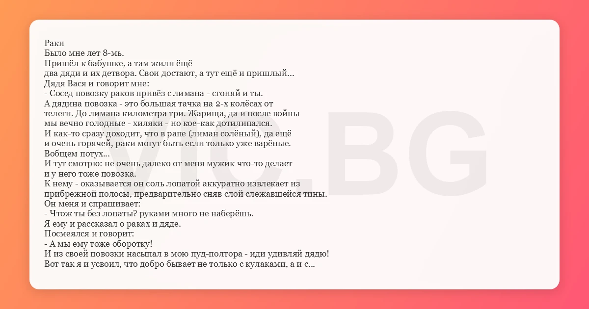 Раки Было мне лет 8-мь. Пришёл к бабушке, а там жили ёщё два дяди и их детвора. Свои достают, а тут ещё и пришлый... Дядя Вася и говорит мне: - Сосед повозку раков привёз с лимана - сгоняй и ты. А дядина повозка - это большая тачка на 2-х колёсах от телеги. До лимана километра три. Жарища, да и после войны мы вечно голодные - хиляки - но кое-как дотилипался. И как-то сразу доходит, что в рапе (лиман солёный), да ещё и очень горячей, раки могут быть если только уже варёные. Вобщем потух... И тут смотрю: не очень далеко от меня мужик что-то делает и у него тоже повозка. К нему - оказывается он соль лопатой аккуратно извлекает из прибрежной полосы, предварительно сняв слой слежавшейся тины. Он меня и спрашивает: - Чтож ты без лопаты? руками много не наберёшь. Я ему и рассказал о раках и дяде. Посмеялся и говорит: - А мы ему тоже оборотку! И из своей повозки насыпал в мою пуд-полтора - иди удивляй дядю! Вот так я и усвоил, что добро бывает не только с кулаками, а и с юмором.