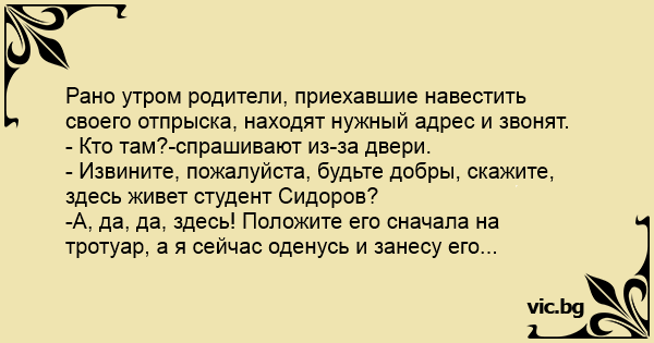 Рано утром родители, приехавшие навестить своего отпрыска, находят нужный адрес и звонят.