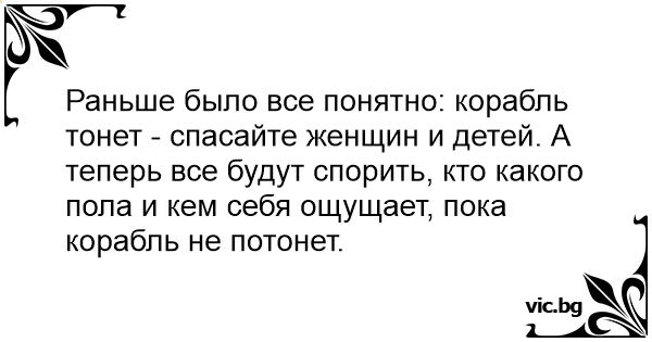 Раньше было все понятно: корабль тонет - спасайте женщин и детей. А теперь все будут спорить, кто какого пола и кем себя ощущает, пока корабль не потонет.